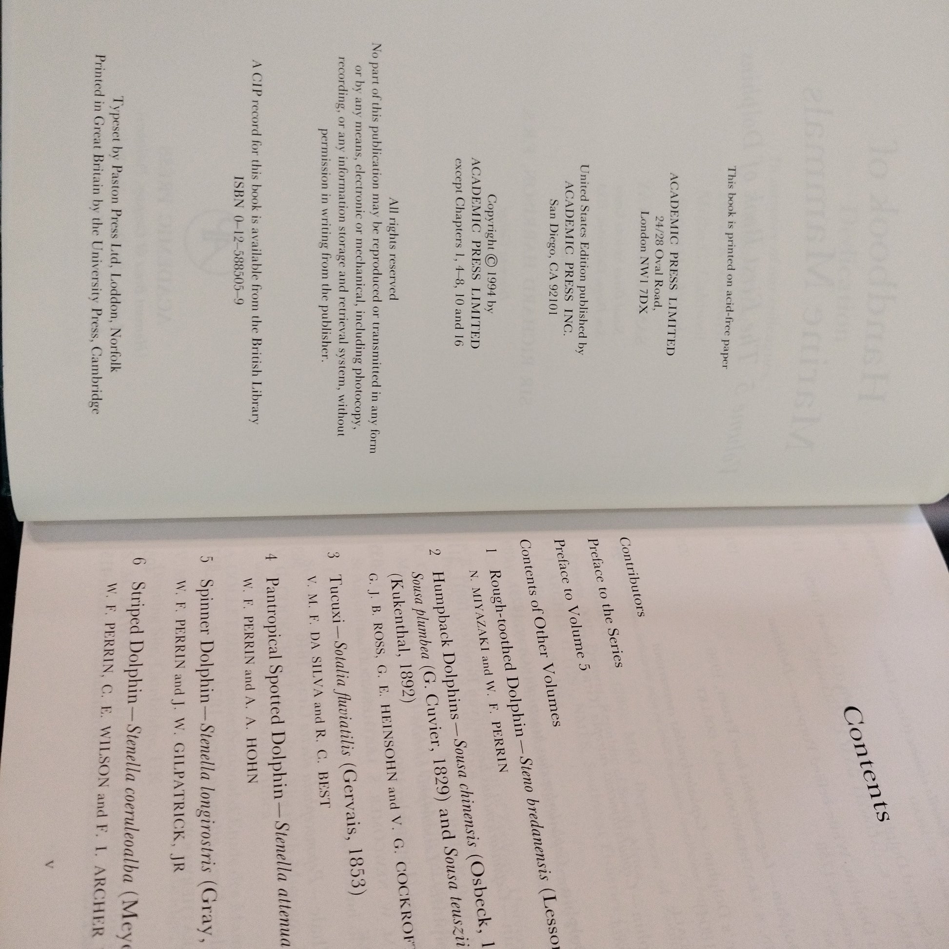 Handbook of Marine Mammals edited by Sam H. Ridgway and Sir Richard Harrison. First edition. Vol 5 The First Book of Dolphins.